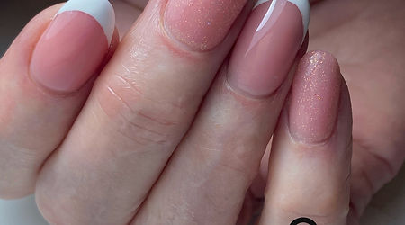 Het verlenging van nagels met tips of sjabloon, opbouwen, afgedekt met de klassieke French.